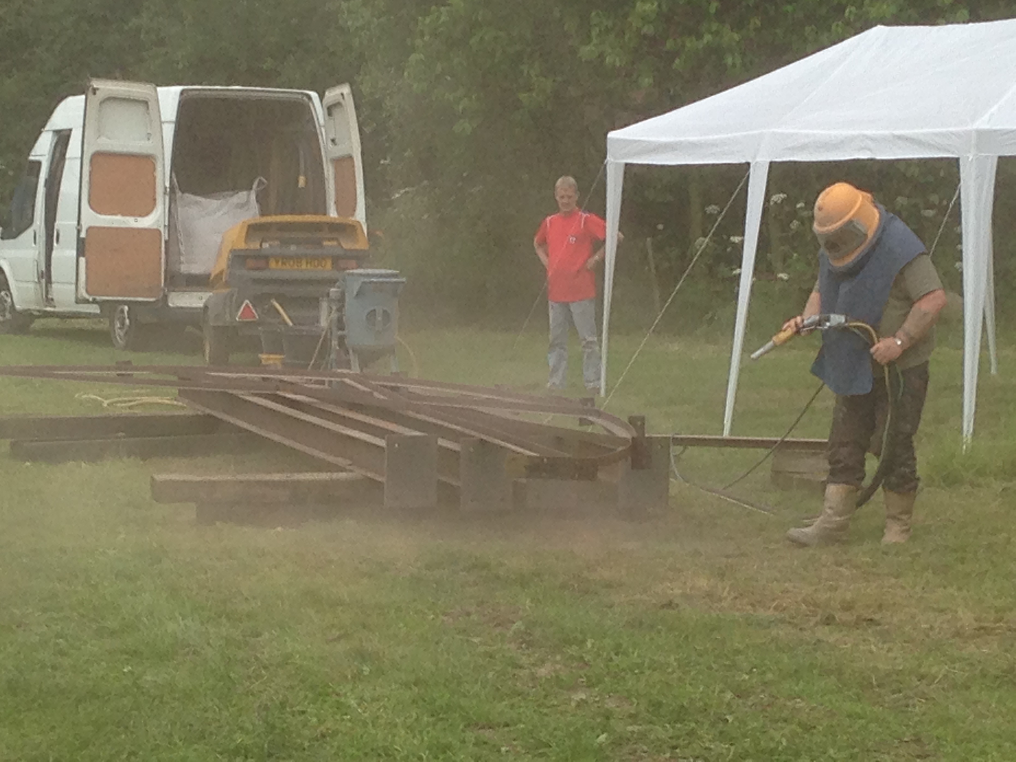 Early in June 2013, Andy & Paul from Blastek came and spent 2 days sandblasting the frame. We were dead lucky with the dry weather, and the start of what turned out to be a long hot spell. I hated the noise the sand blaster made, and made myself scarce in the house until it had gone.