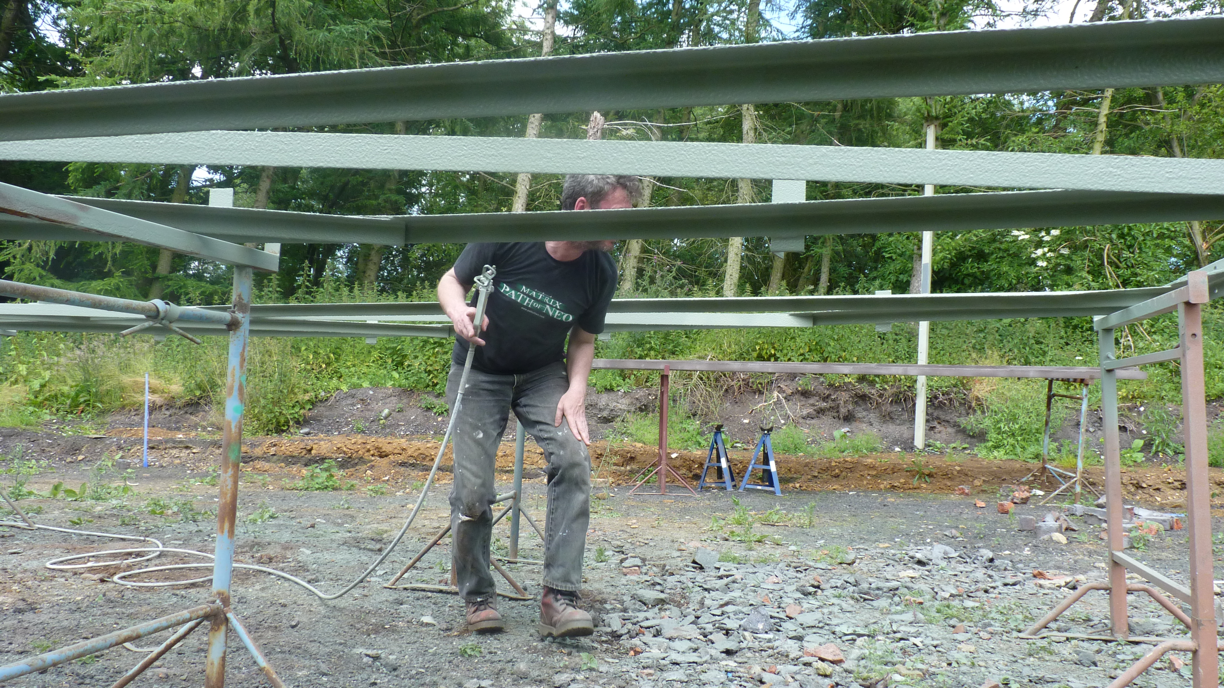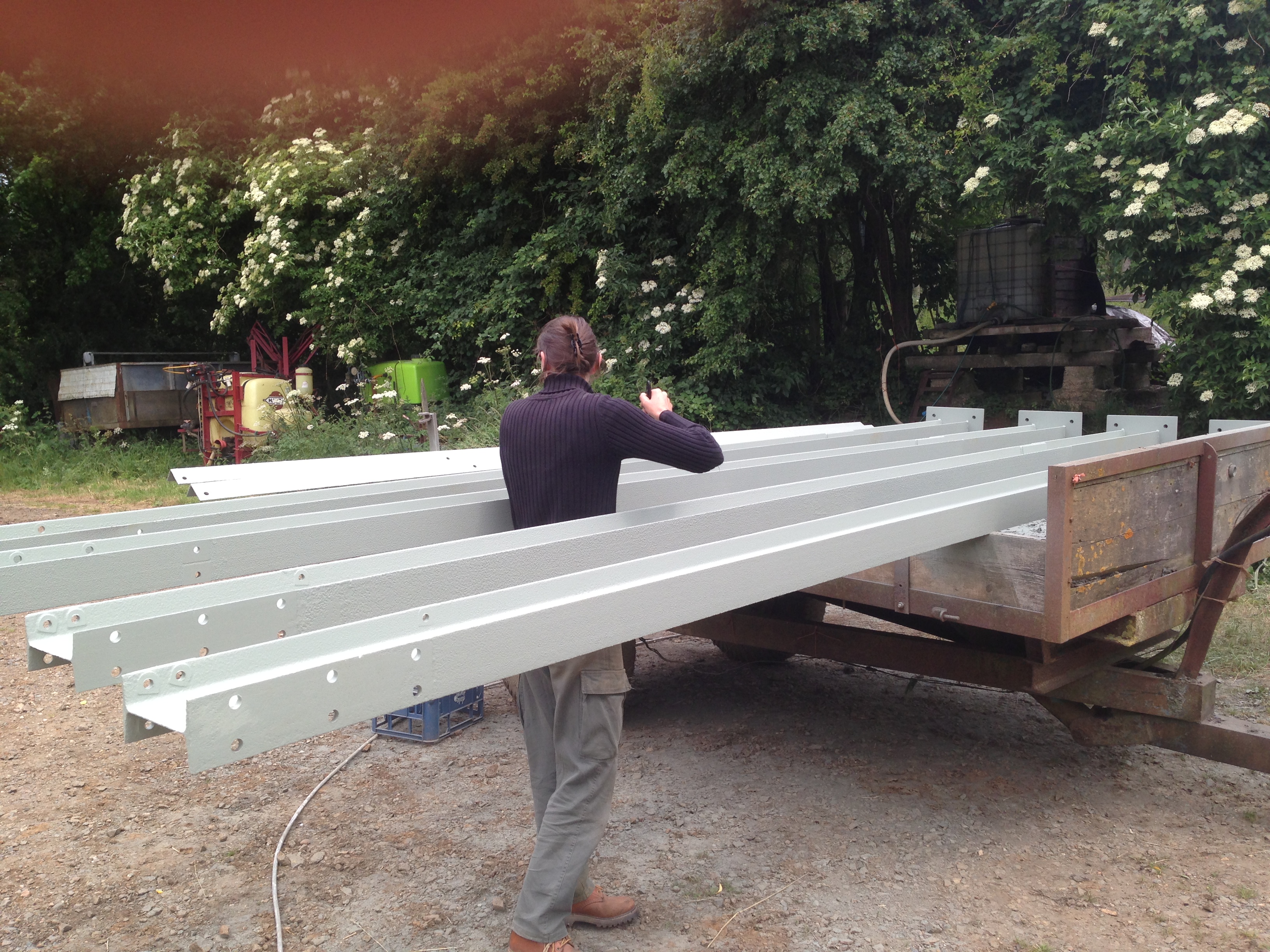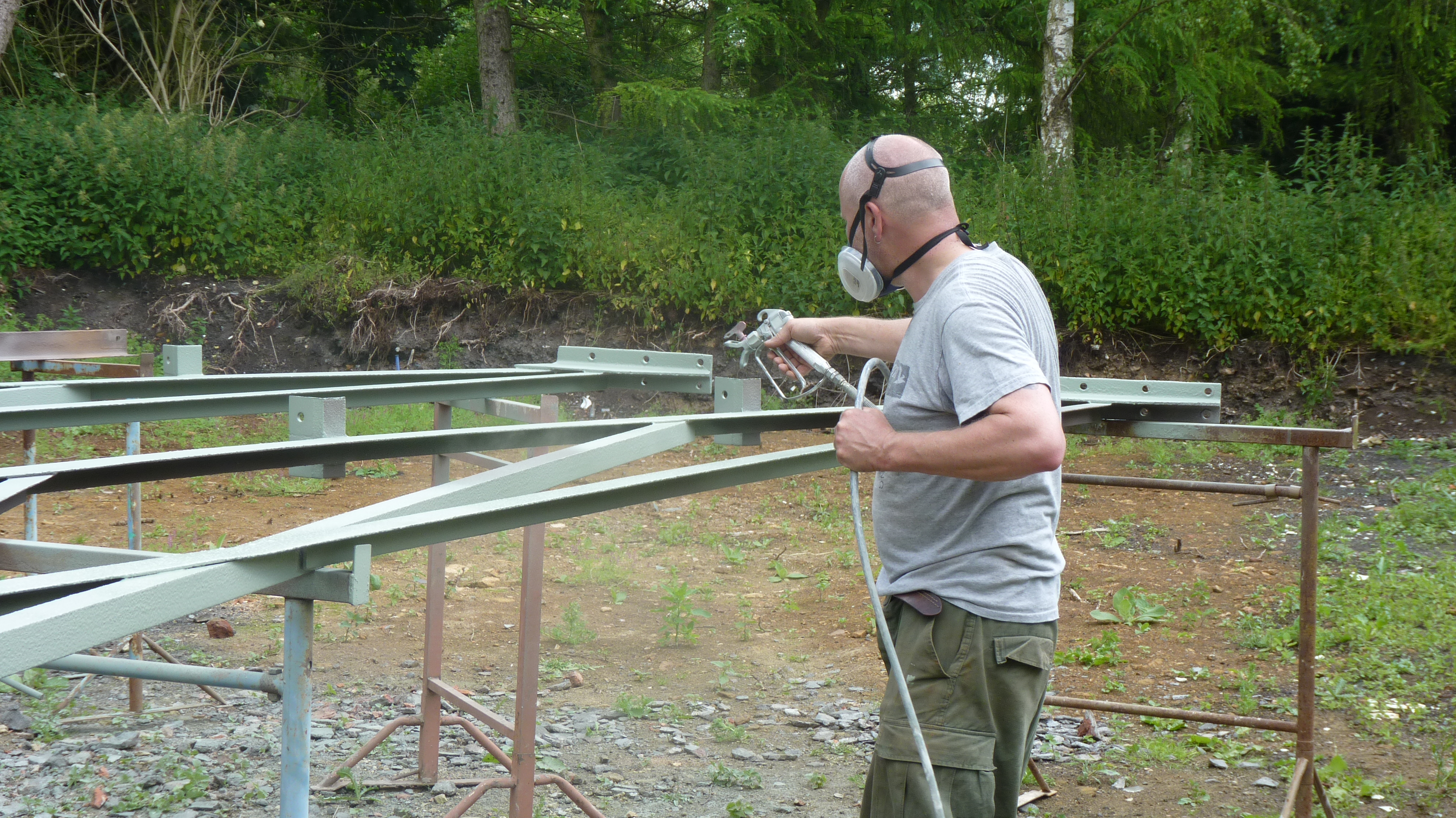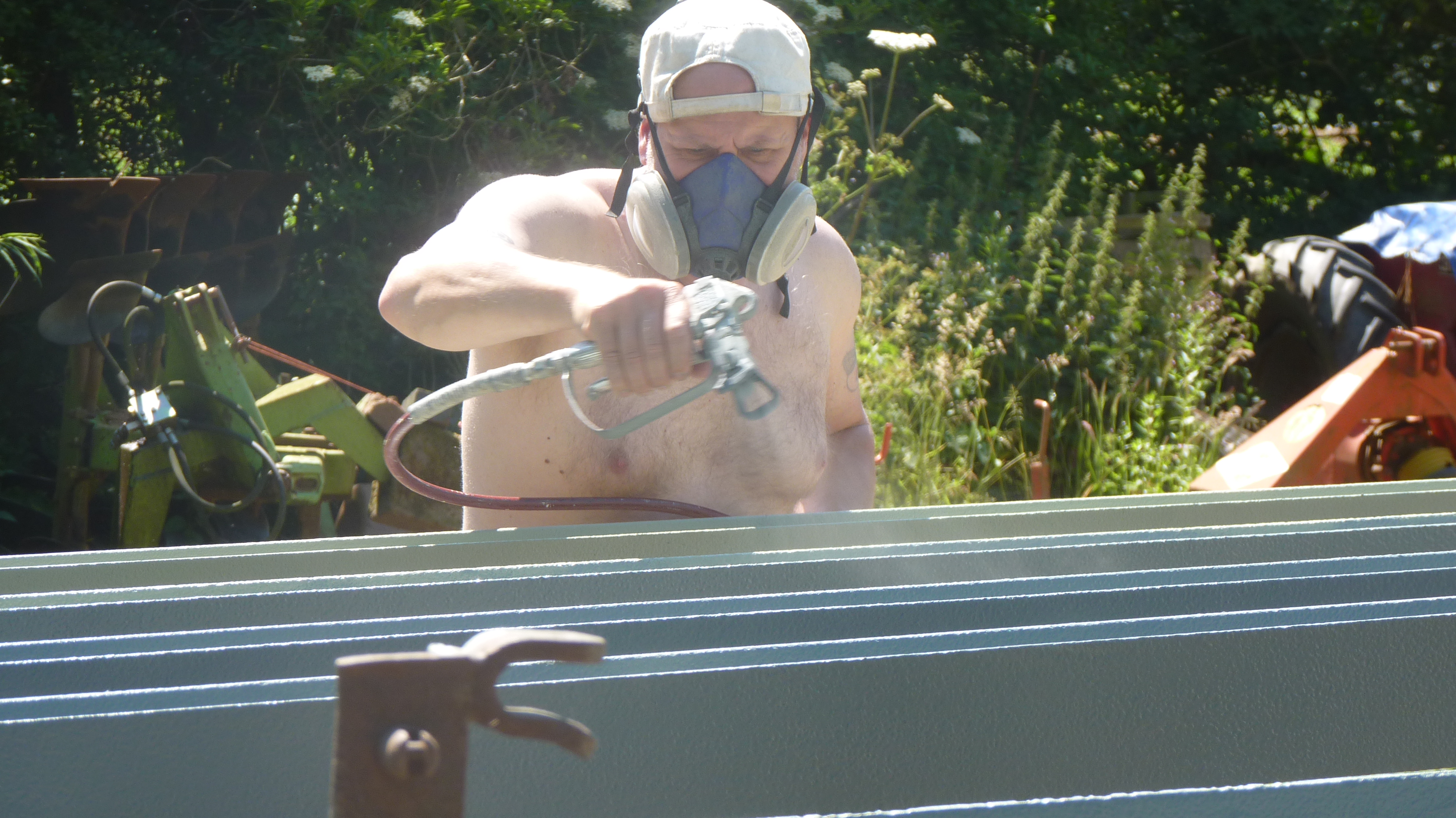 Meanwhile, as Andy & Paul cleaned the steel, Katie, Rob and their friend Dave spent the next week spraying the clean steel with 2 coats of Peganox rust prevention paint, then 1 coat of Mathys cladding Top-coat paint.