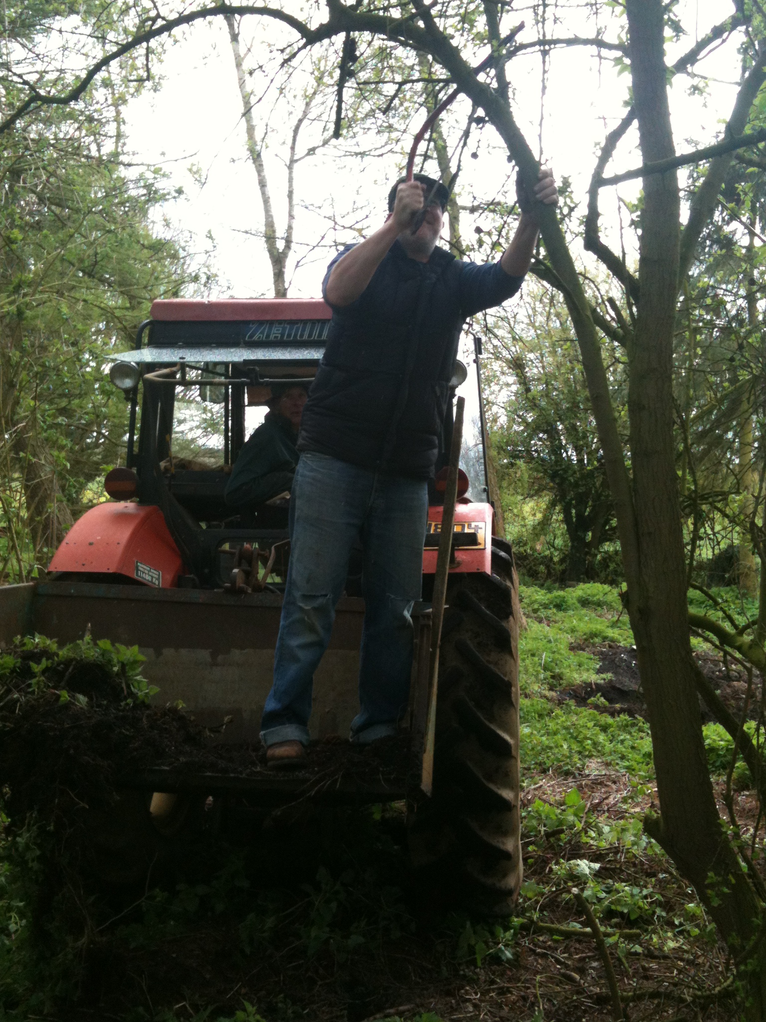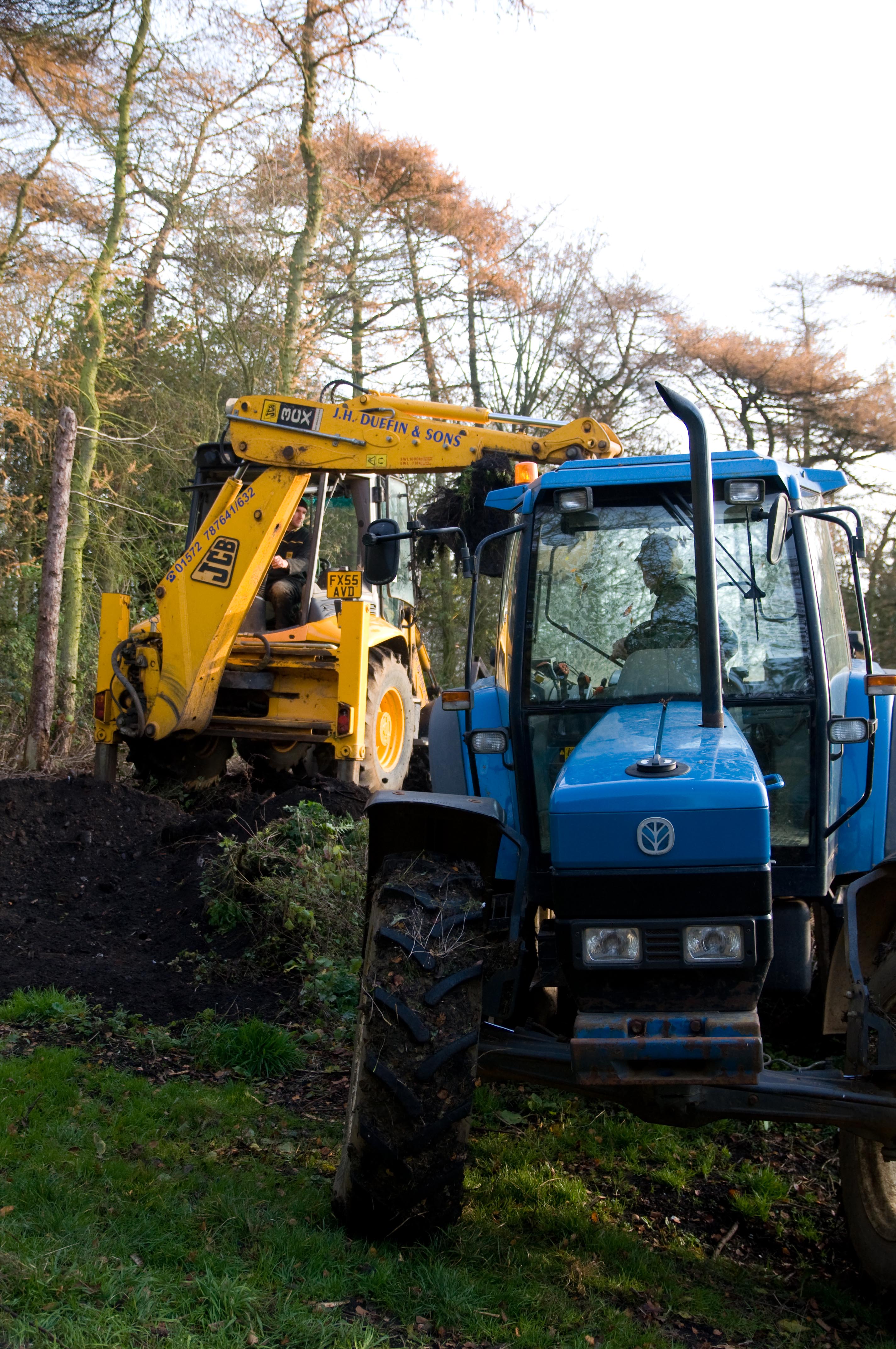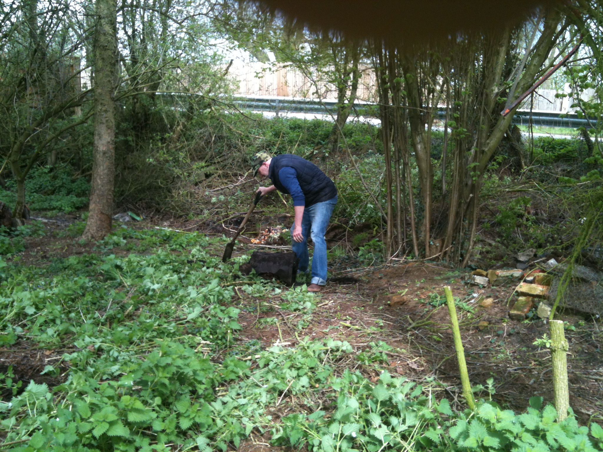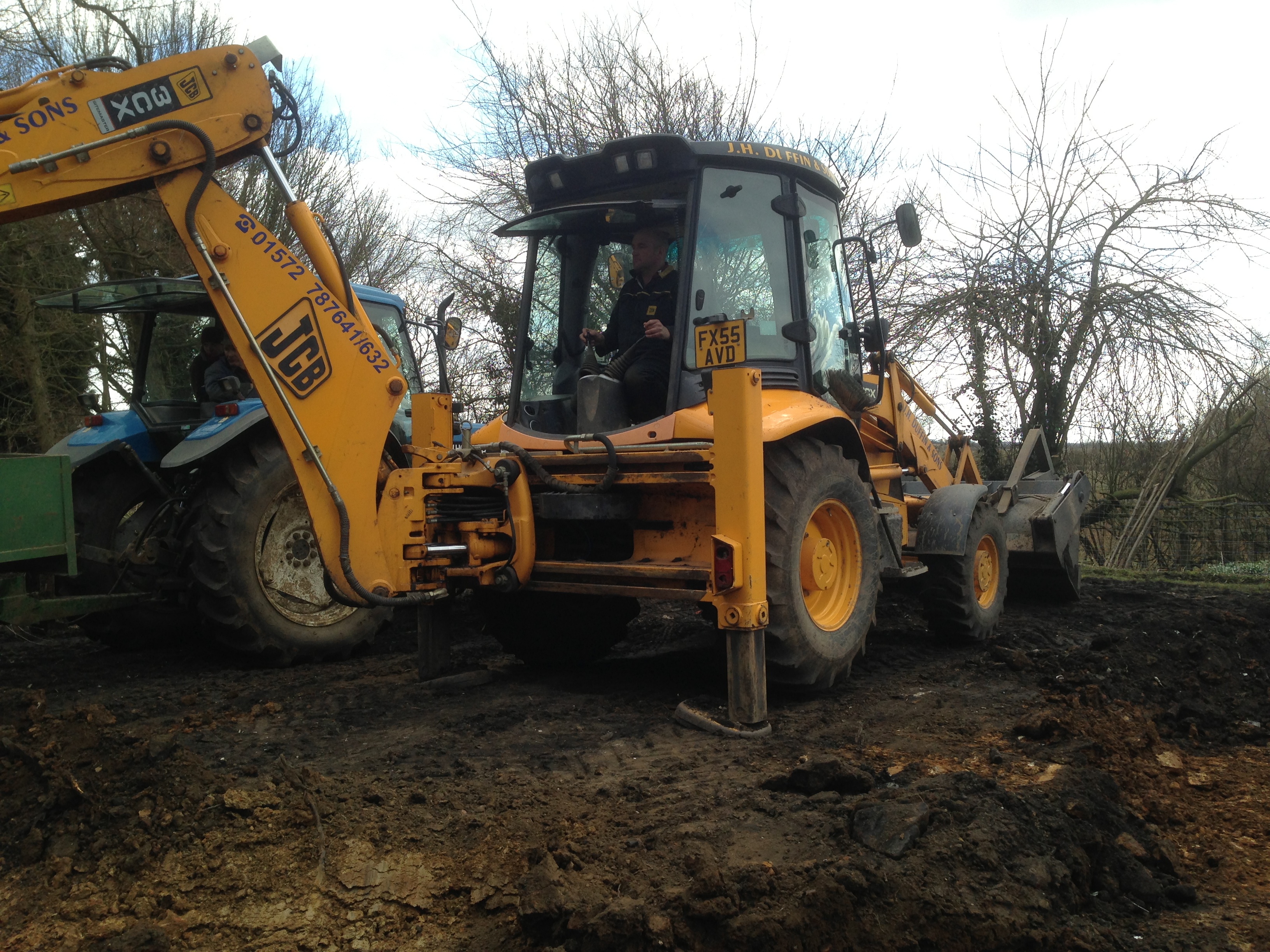 Brian, from local contractors H Duffin & sons, came with his JCB and levelled the site. Over two days, he removed nearly 1ft of soil from the site, which was moved to the back of the site, next to the road. Here it was added to a 10ft high bund, to shield the site from roads noise. This process brought us all into much closer contact with the site’s former use as the village tip. We found hundreds of old bottles, as well as tons of rotting metal, cattle bones and boot soles!