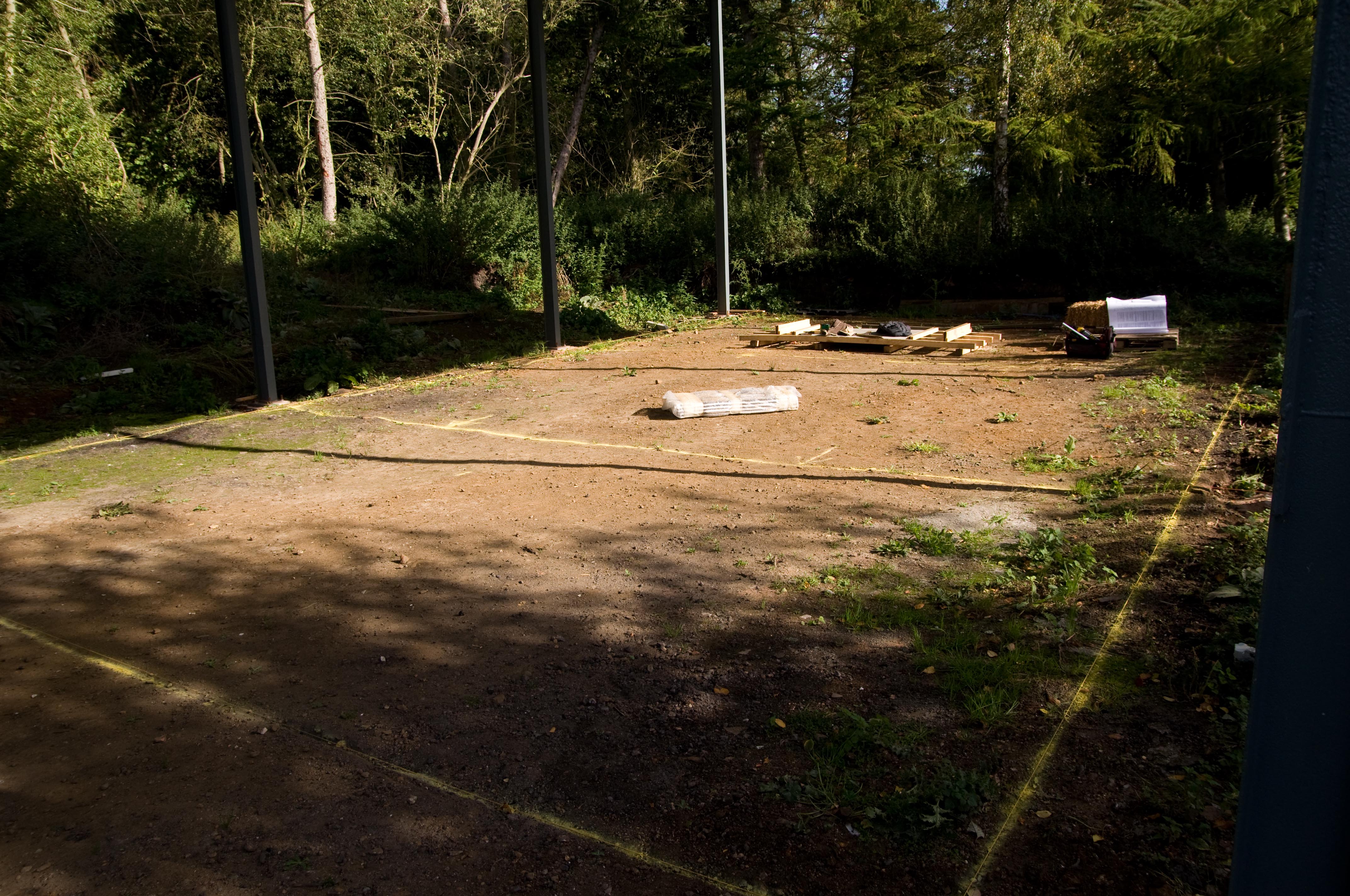 As the summer tried to come to an end, the Two-Legs finally got round to some construction. A day was spent working out how to get the plans and the reality to match! The plans were drawn up from the barn when it was still standing in its original site. Our measurements come from the barn as it is now, refurbished and at its new location. Surprisingly, after a bit of crap maths, and a lot of string and bits of wood, we got paper and metal to match!