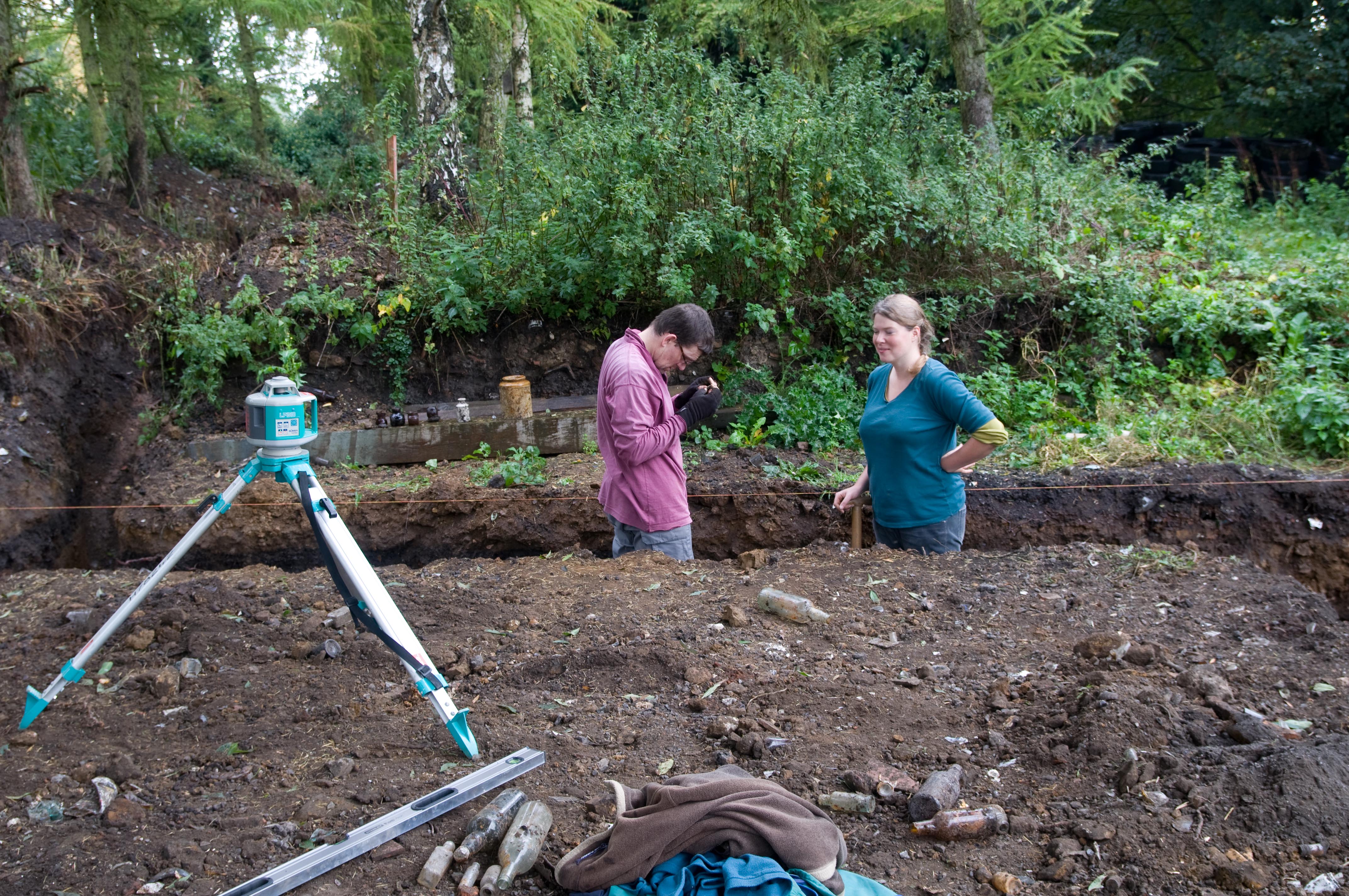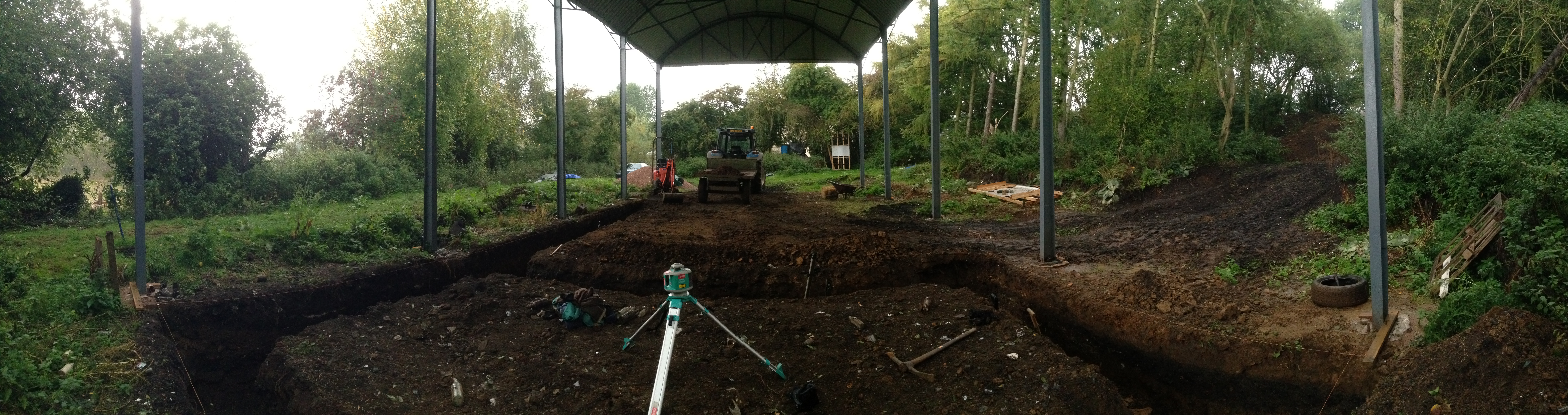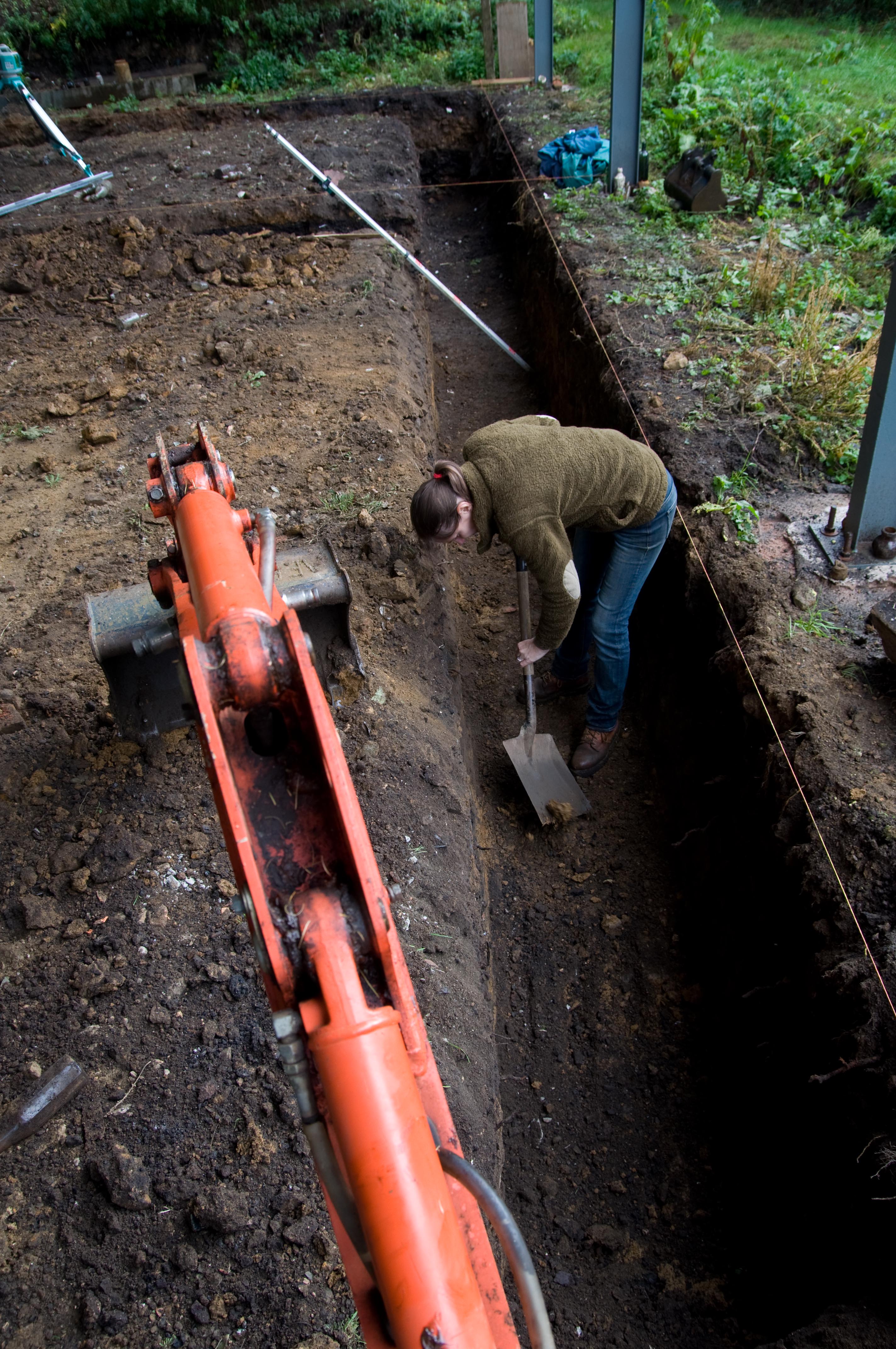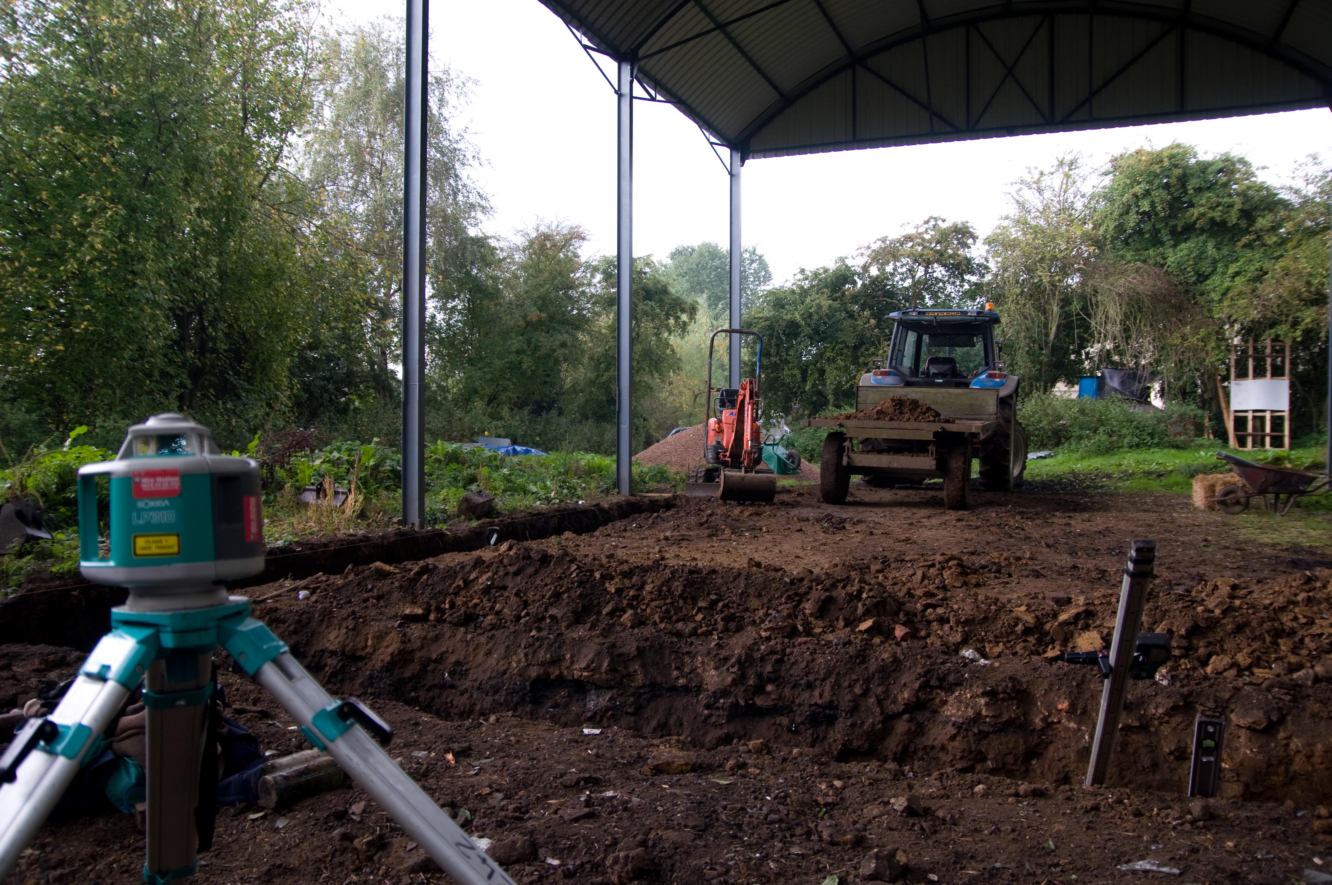 By the end of the week, we had dug out half of the trenches for the foundations, and flattened and levelled them all off, with the help of Guy and Viv. We had shifted approximately 15 tonnes of soil, and a small bit of recalcitrant concrete from one of the barn footings that jutted into a trench!